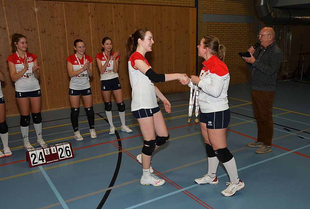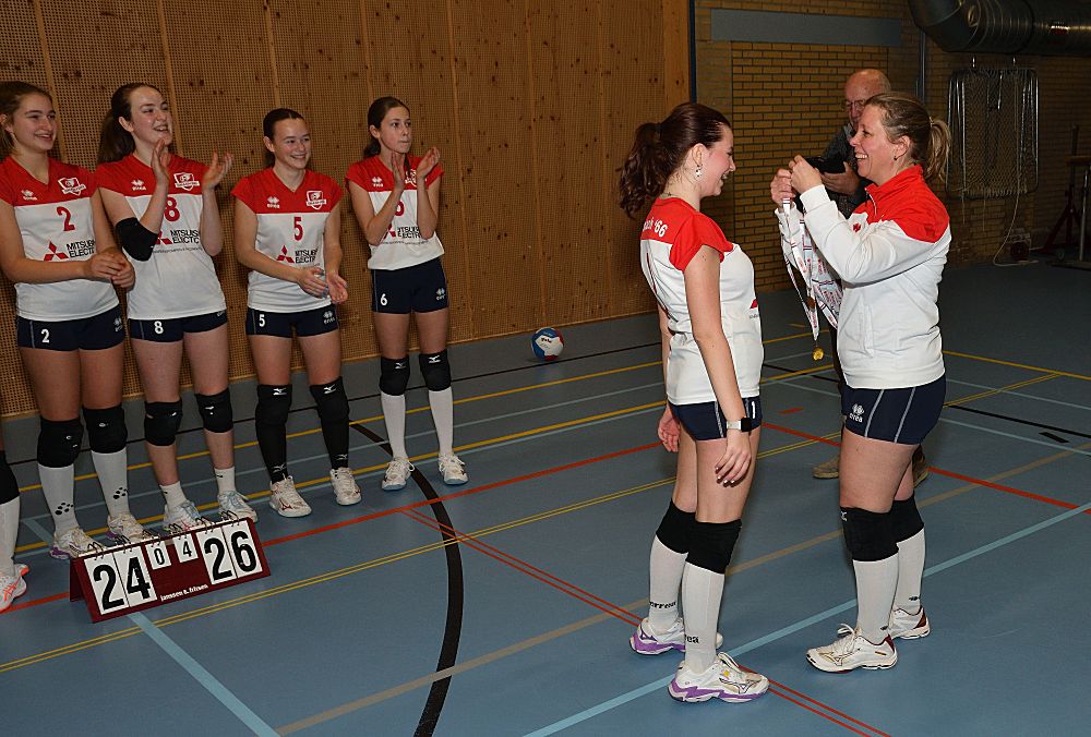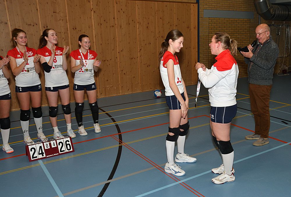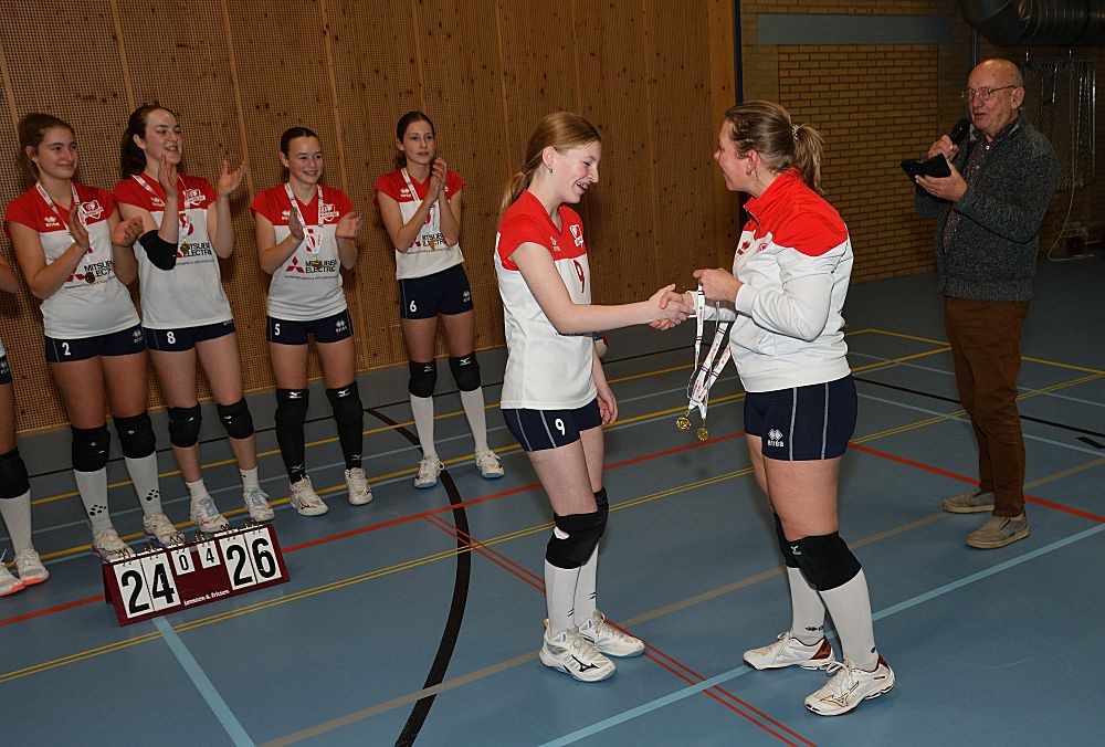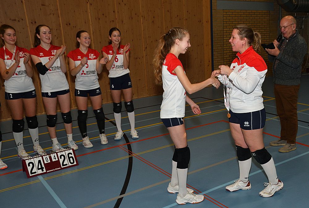 Omdat Meisjes B1 in de eerste helft van de competitie kampioen geworden zijn in de 1e klasse, werden ze afgelopen vrijdagavond 16 januari even in het zonnetje gezet. De voorzitter sprak ze nog even toe en ze kregen allemaal een medaille uitgereikt door Jarka.