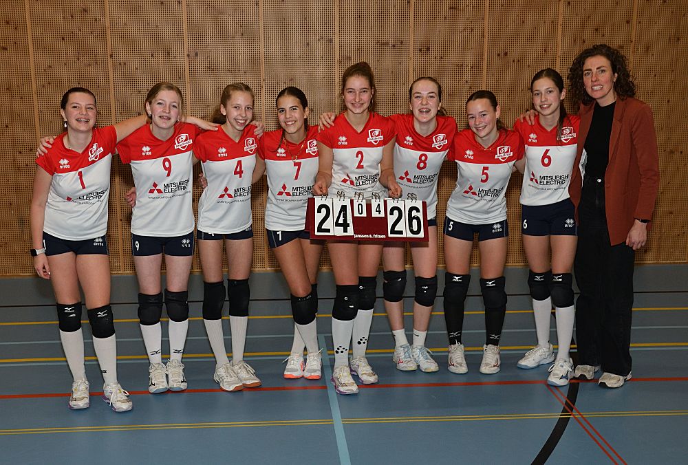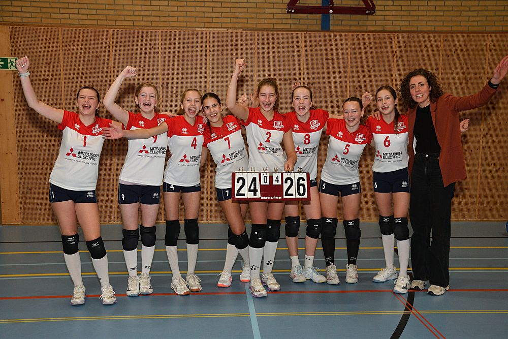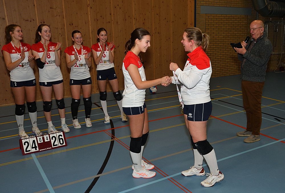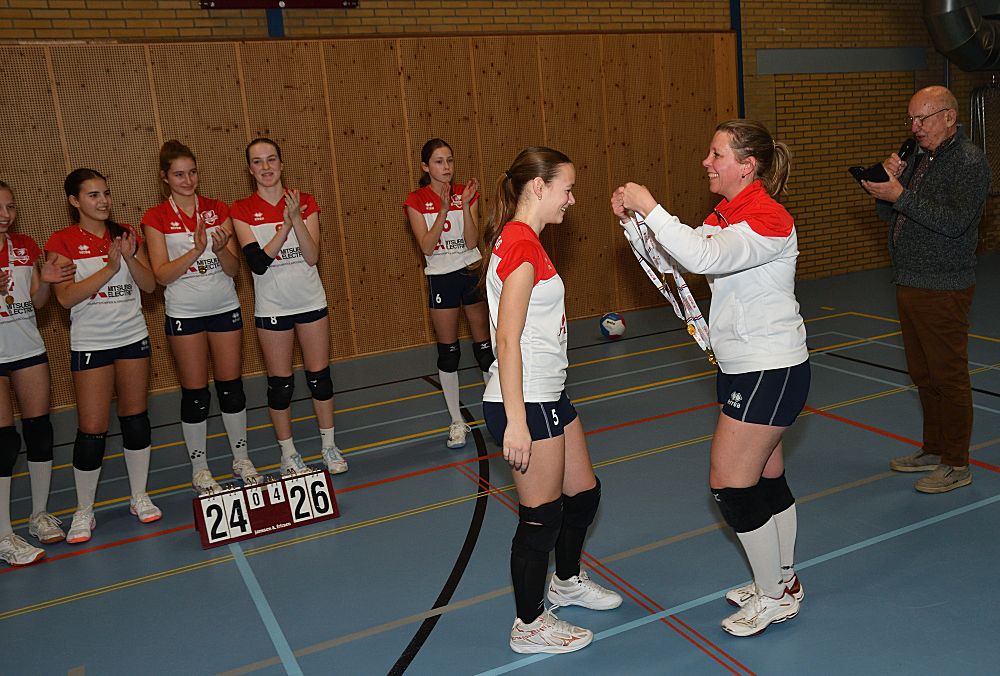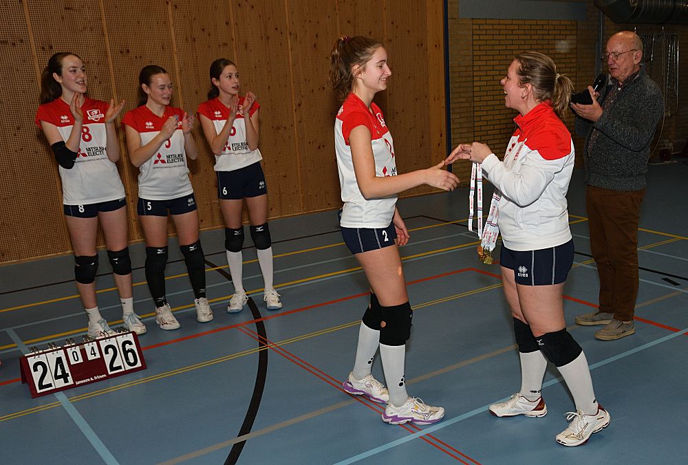 Omdat Meisjes B1 in de eerste helft van de competitie kampioen geworden zijn in de 1e klasse, werden ze afgelopen vrijdagavond 16 januari even in het zonnetje gezet. De voorzitter sprak ze nog even toe en ze kregen allemaal een medaille uitgereikt door Jarka.