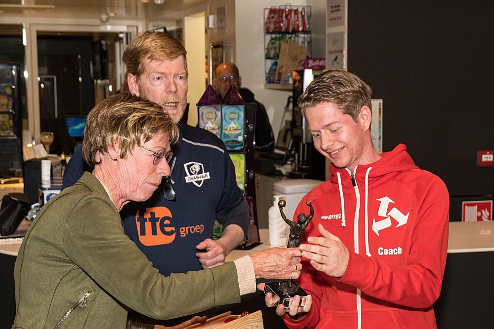 Nathan de Baat ontvangt de Leo vd Velde trofee van ereleden Lykele Bokhorst en Tonny Ossel.